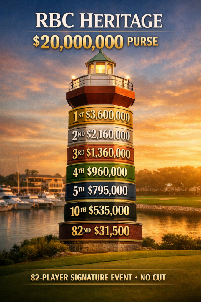 The RBC Heritage carries a $20 million total purse, with the winner taking home $3.6 million. As a Signature Event, there is no 36-hole cut. All 82 players in the field compete across all four rounds.